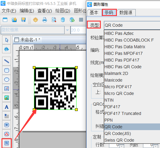 在二维码软件中新建标签后,点击软件左侧的“绘制二维码”按钮,在画布上绘制二维码对象,双击二维码,在图形属性-条码选项卡中,根据自己的需求自定义设置二维码码制,这里以QR code为例。