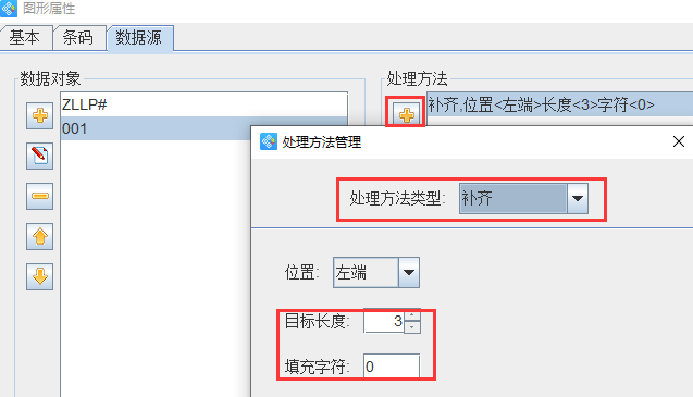 在右侧的处理方法中,点击“+”号按钮,处理方法类型选择“补齐”,目标长度为3,填充字符为0,点击添加。
