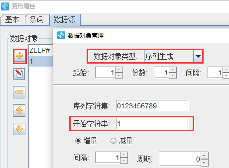 点击“+”号按钮,数据对象类型选择“序列生成”,开始字符串为1,点击添加。