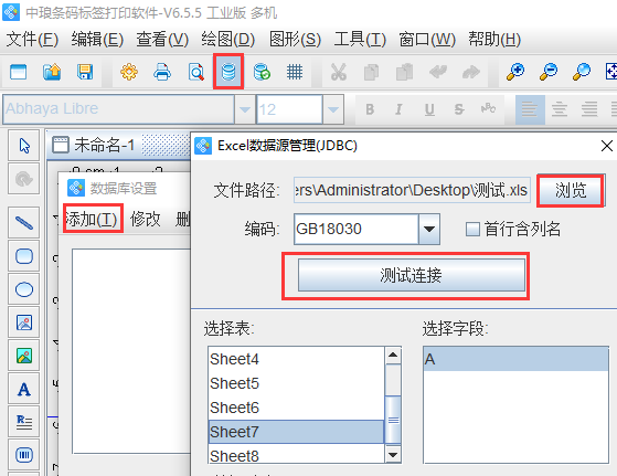 在二维码软件中,新建标签后,点击软件上方工具栏中的数据库设置按钮,点击“添加”,选择要导入的数据库类型(excel表),根据提示点击“浏览-测试连接-添加-关闭”。