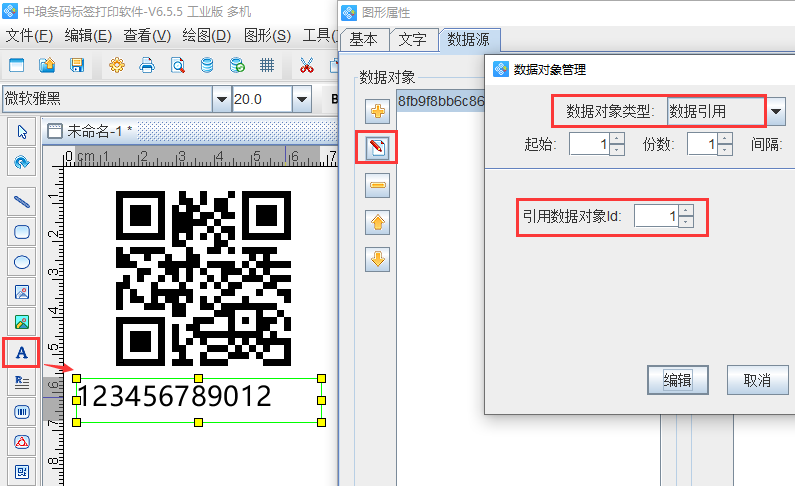 点击软件左侧的“实心A”按钮,在画布上绘制普通文本,双击普通文本,在图形属性-数据源中,点击“修改”按钮,数据对象类型选择“数据引用”,在引用对象ID中,输入二维码的ID,点击编辑。