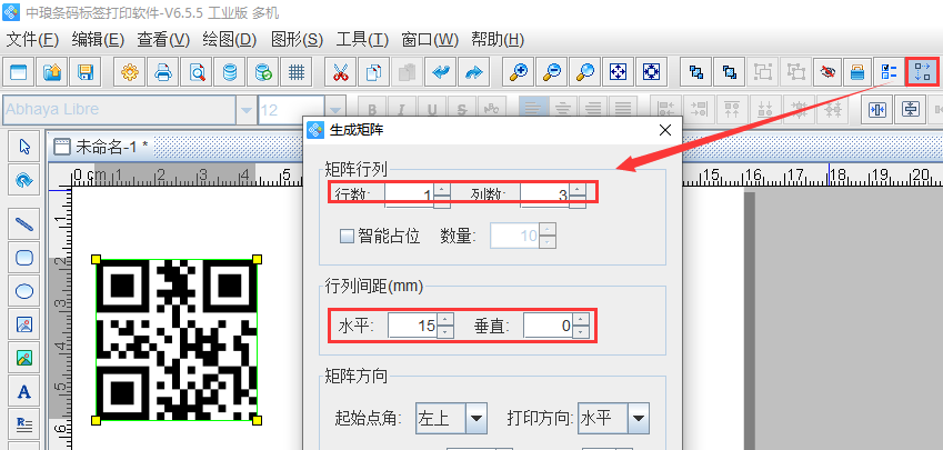 选中二维码对象,点击软件上方工具栏中的“生成矩阵”按钮,在生成矩阵对话框中,设置矩阵行列及水平间距,点击确定。