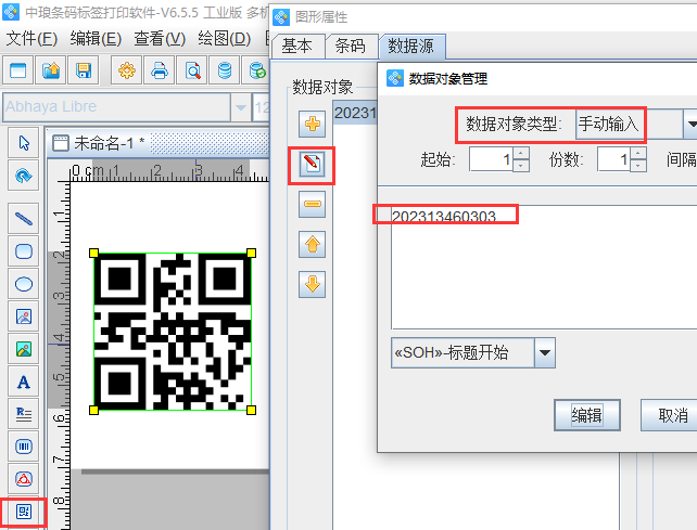 点击软件左侧的“绘制二维码”按钮,在画布上绘制二维码对象,双击二维码,在图形属性-数据源中,点击“修改”按钮,删除默认的数据,在下面的输入框中手动输入要添加的信息,点击编辑-确定。