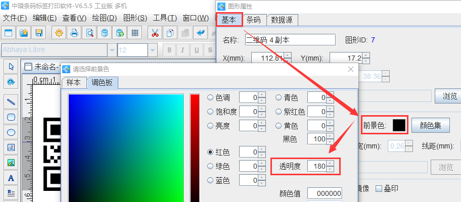 双击中间的二维码,在图形属性-基本里面,点击前景色-调色板,我们可以看到这里的黑色为100,可以将其调整为70,点击确定。