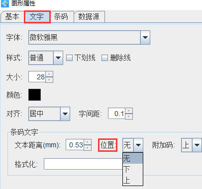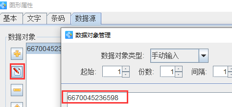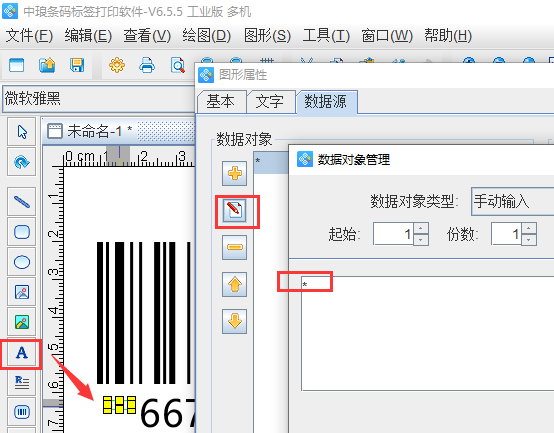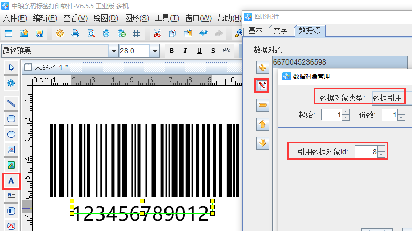 点击软件左侧的“实心A”按钮,在画布上绘制普通文本,双击普通文本,在图形属性-数据源中,点击“修改”按钮,数据对象类型选择“数据引用”,在引用对象ID中,输入条形码的ID,点击编辑-确定。