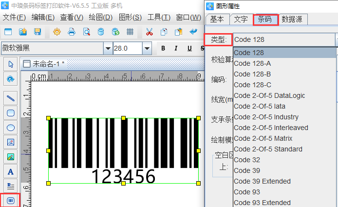 在条码编辑软件中,点击软件左侧的“绘制*维条码”按钮,在画布上绘制条形码对象,双击条形码,在图形属性-条码选项卡中,设置条码类型为code 128。