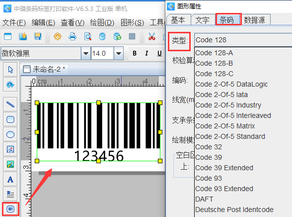 在桌面上新建*个TXT文本之后,打开条码打印软件,新建标签之后,点击软件左侧的“绘制*维条码”按钮,在画布上绘制*个条形码,双击条形码,在条码选项卡中,设置条码类型为code128.