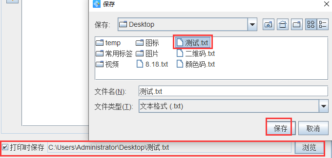 勾选下面的“打印时保存”前面的复选框,点击“浏览”,选中刚刚新建的TXT文本,点击保存-确定。