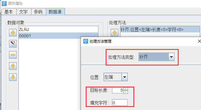 在右侧的处理方法中,点击“+”号按钮,处理方法类型选择“补齐”,目标长度为5,填充字符为0,点击添加-确定。