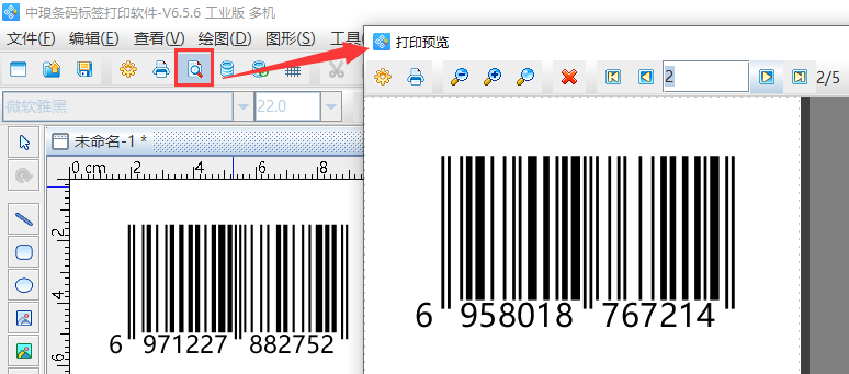 设置好条码后,点击软件上方工具栏中的“打印预览”按钮或者“文件-打印预览”,查看批量生成效果。