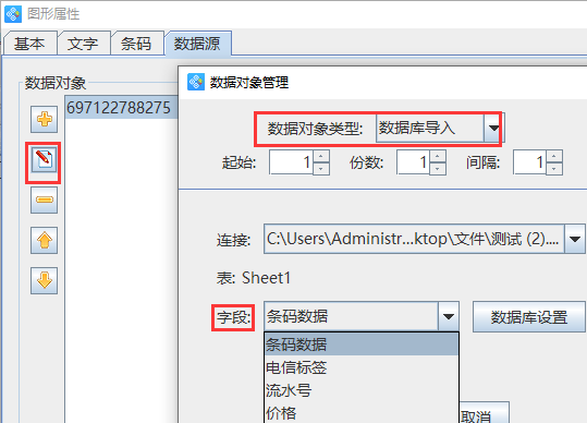 在数据源中,点击“修改”按钮,数据对象类型选择“数据库导入”,在字段中选择相应的字段,点击编辑-确定。