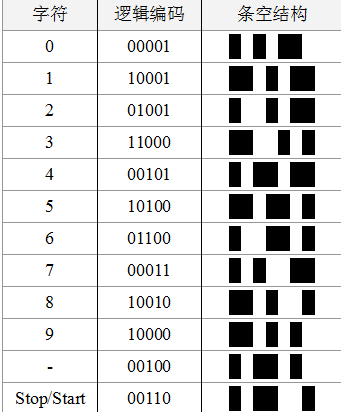0表示窄条与窄空,1表示宽条与宽空,由编码表可以看出,“0”、“9”、“-”这三个字符只有*个宽元素,其他字符都有两个宽元素。