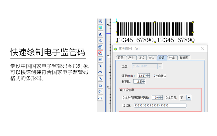 8.专设国*电子监管码。采用UCC/EAN 128码,严格遵从国*电子监管码标准,设置方便而又不失灵活。